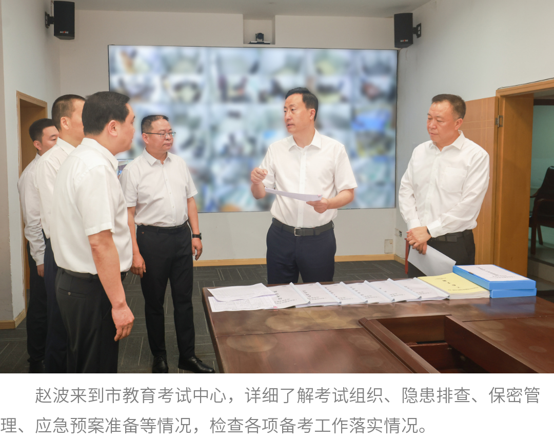2025年高考开考在即。6月6日,市委书记赵波前往市教育考试中心和部分考点学校,检查全市2025年高考备考工作。他强调,要深入学习贯彻习近平总书记关于教育的重要论述和关于高考综合改革的重要指示批示精神,全面落实党中央、国务院和省委、省政府部署安排,精心精细做好组织服务保障工作,确保全市高考安全顺畅、平稳有序。