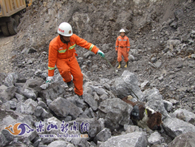 值得一提的是,在搜救犬的帮助下,救援人员很快确定了一个可疑的被埋点。下午6点左右,施救人员在该点发现一辆整体的货车残骸。但是,由于周围全是巨石,必须进行爆破后方能施救。