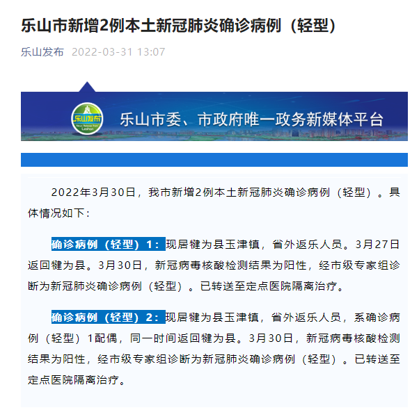 乐山市新增2例本土新冠肺炎确诊病例(轻型)