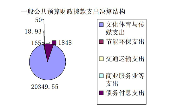 2018年一般公共预算财政拨款支出22431.48万元,主要用于以下方面:文化体育与传媒支出(类)20349.55万元,占90.72%;节能环保支出(类)165万元,占0.74%;交通运输支出(类)18.93万元,占0.08%;商业服务业等支出(类)50万元,占0.22%;债务付息支出(类)1848万元,占8.24%。