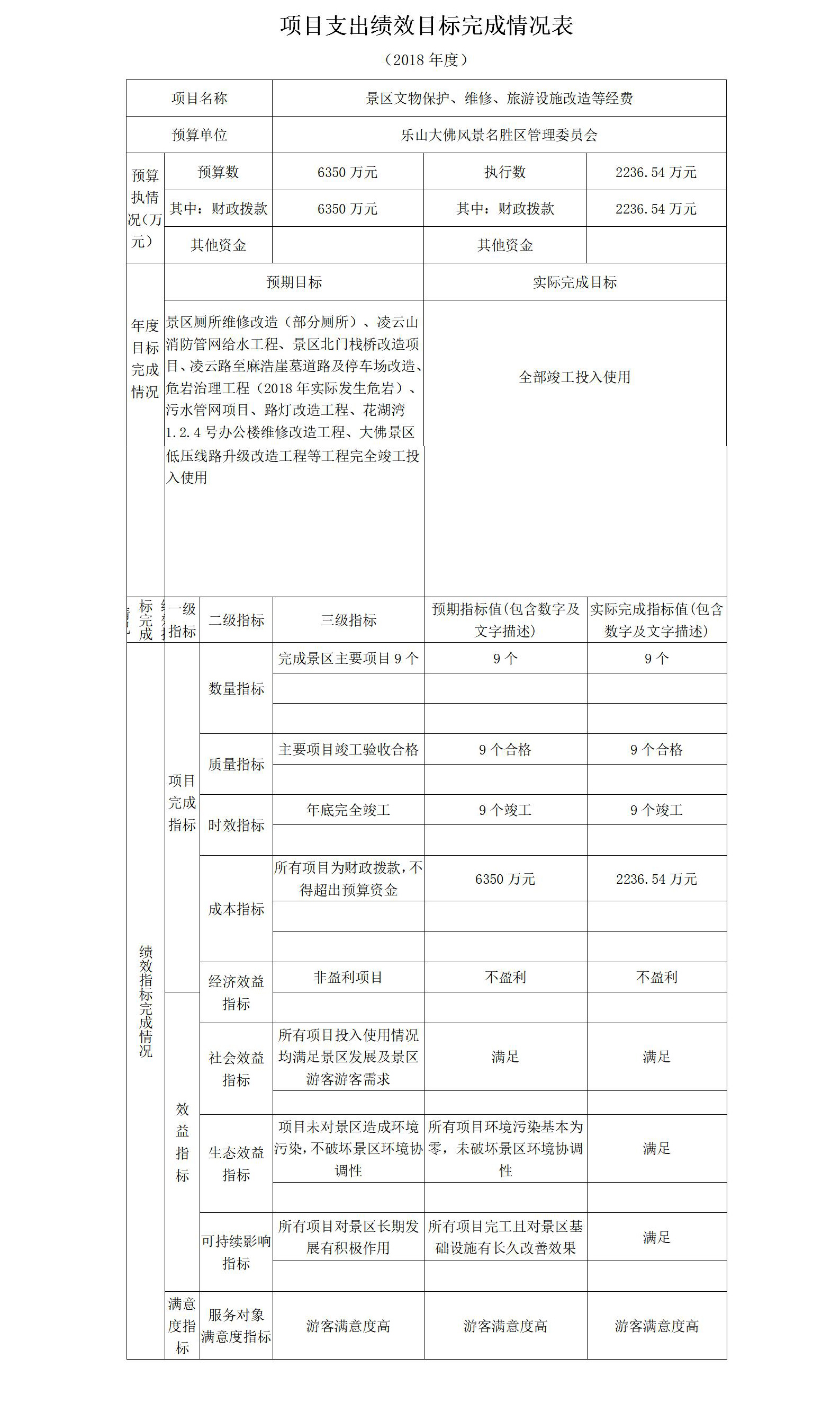 2、景区文物保护、维修、旅游设施改造等经费综述。本项目2018年预算数6350万元,执行数2236.54万元,全部为财政拨款,完成预算的35.22%(其中:预算数中4100万元为2018年度超收收入,安排用于2019年工程项目支出,扣除4100万元之后实际完成预算数99.4%)。今年主要完成主要项目9个,主要包括景区厕所维修改造(部分厕所)、凌云山消防管网给水工程、景区北门栈桥改造项目、凌云路至麻浩崖墓道路及停车场改造、危岩治理工程(2018年实际发生危岩)、污水管网项目、路灯改造工程、花湖湾1.2.4号办公楼维修改造工程、大佛景区低压线路升级改造工程等工程。目前均已按时全面完工,并通过相关竣工验收正常投入使用。所有项目按照流程建设完成,目前为止没有发现问题,在今后的项目建设中,进一步加大监管力度,确保各项目更好的完成。