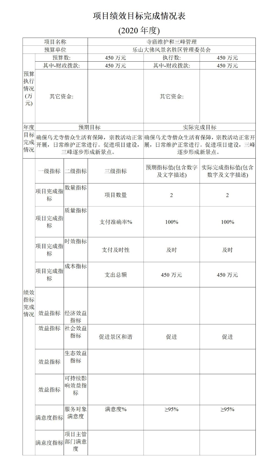 (4)寺庙维护和三峰管理项目绩效目标完成情况综述。项目全年预算数450万元,执行数为450万元,完成预算的100%。通过项目实施,乌尤寺僧众生活有保障,宗教活动正常开展,按文物保护要求,日常零星维护正常开展,乌尤山环境得到改善。发现的主要问题:受疫情影响,今年财政困难,财政资金拨付不够及时。下一步改进措施:门票分成继续按时拨付,确保寺庙正常支出和宗教活动正常开展,不断提升乌尤寺品质。