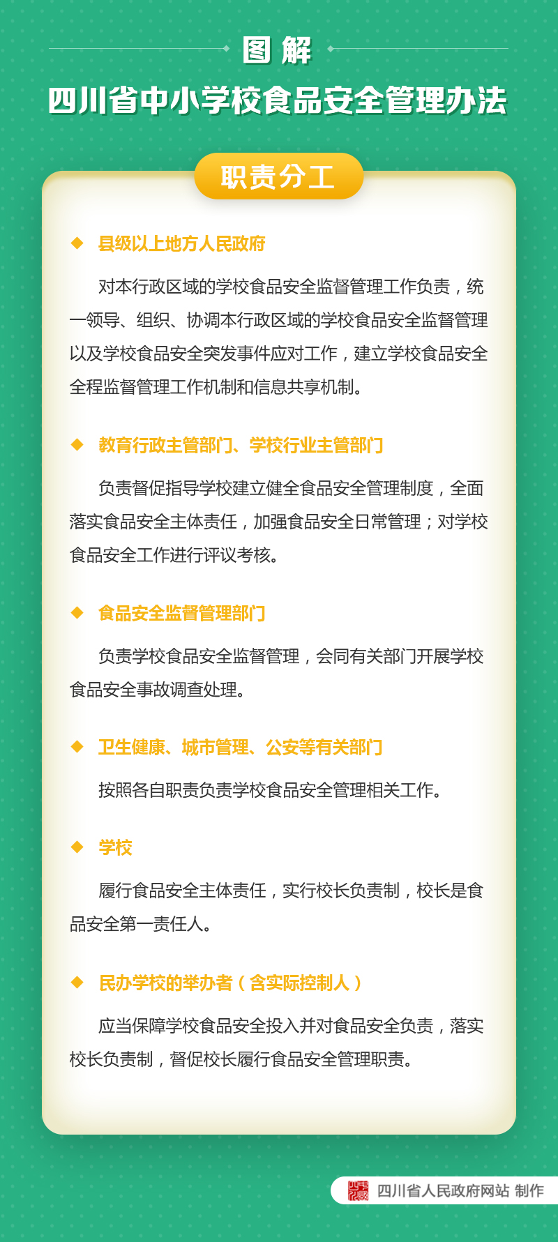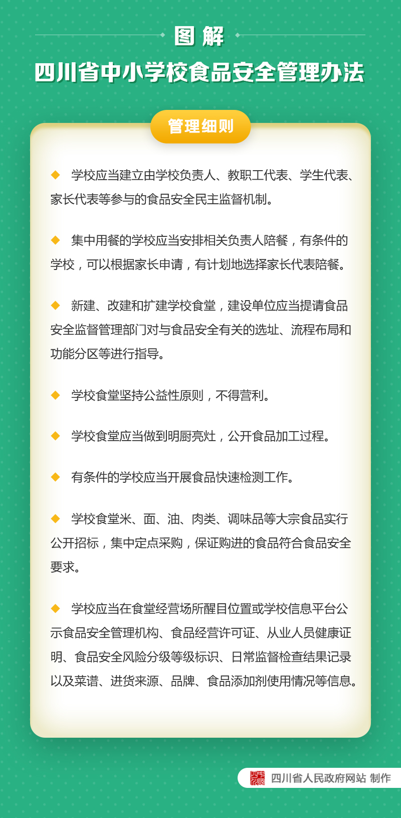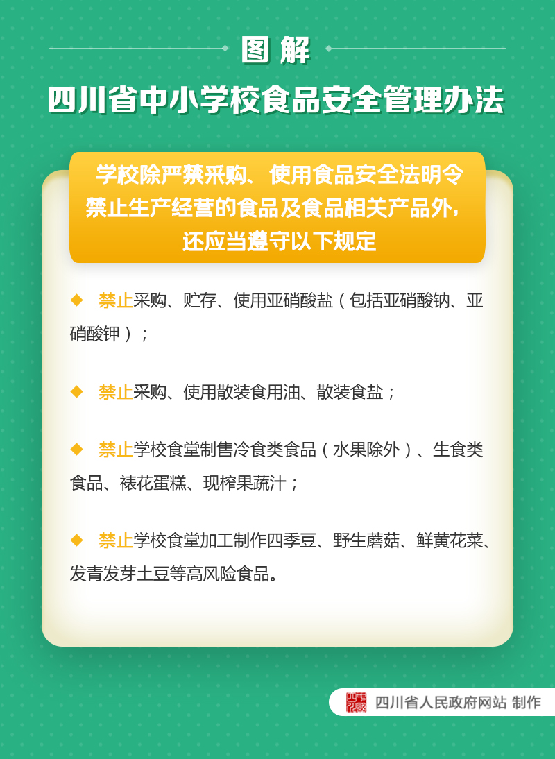 适用于四川省行政区域内的普通高中学校、中等职业学校、义务教育学校,幼儿园的《四川省中小学校食品安全管理办法》(以下简称《办法》)正式出台,自2020年3月1日起施行。