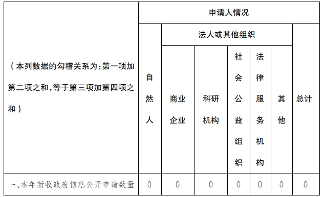 | 一、本年新收政府信息公开申请数量 | 0 | 0 | 0 | 0 | 0 | 0 | 0 | ||