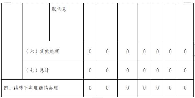 | 四、结转下年度继续办理 | 0 | 0 | 0 | 0 | 0 | 0 | 0 | ||